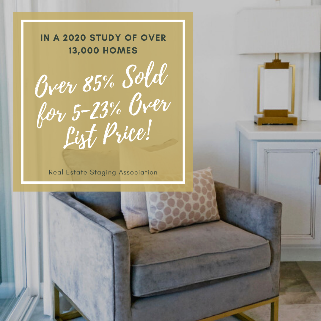 According to RESA, the Real Estate Staging Association: Once staged, homes spend 73 percent less time on market than un-staged homes. Homes staged prior to listing sold in 42 days on average.